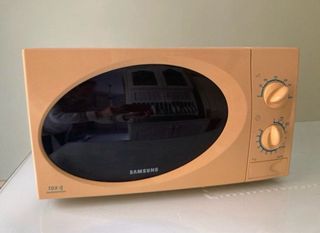 Microondas Samsung en color naranja con diseño ovalado. - Puerta con cristal tintado. - Dos mandos giratorios para ajuste de tiempo y potencia. - Marca: Samsung. - Modelo: TDS.