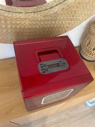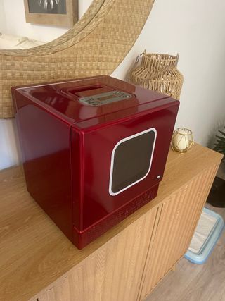 Microondas de color rojo brillante con panel de control digital. - Diseño moderno y compacto. - Ventana frontal con marco blanco.
