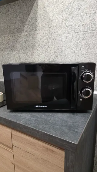 Microondas en color negro, con un diseño moderno y elegante. - Marca: Orbegozo - Color: Negro - Controles giratorios para potencia y tiempo.