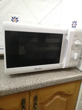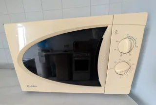 Microondas de la marca Bluesky en buen estado. Su diseño es moderno y funcional. - Color beige. - Puerta con ventana. - Mandos giratorios para tiempo y potencia.