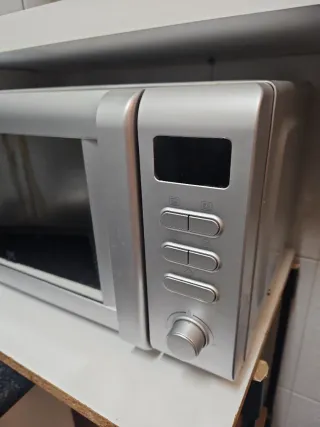 Microondas de color plateado, ideal para tu cocina. - Diseño moderno y compacto. - Panel de control intuitivo. - Botón giratorio para ajustar el tiempo.