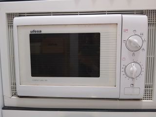 Microondas Ufesa en color blanco, modelo Compact Grill 190. Funciona bien, pero la ruleta no funciona así que hay que pararlo manualmente - Diseño compacto y funcional. - Panel de control con mandos giratorios. - Puerta con ventana. - Rejilla para función grill.