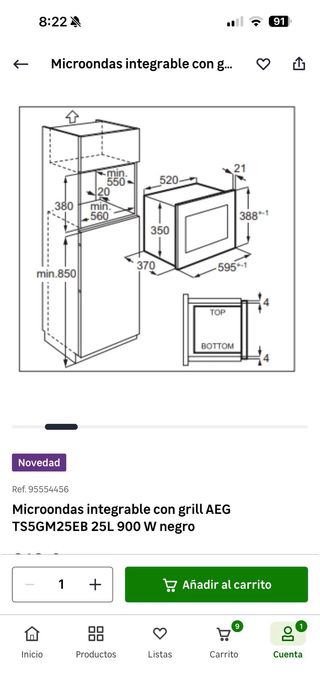 Microondas integrable de la marca AEG con función grill. - Modelo: TS5GM25EB - Capacidad: 25L - Potencia: 900W - Color: Negro Nuevo sin estrenar.
