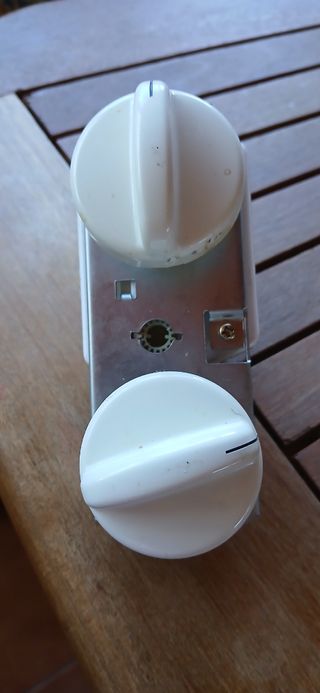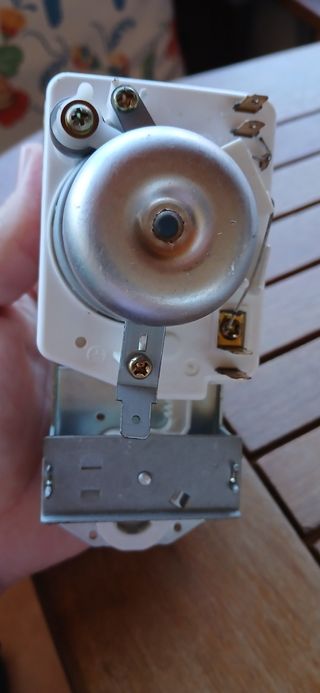 Se vende temporizador para microondas. Está en buen estado, aunque presenta algunas señales de uso. - Dos mandos giratorios de color blanco. - Mecanismo de funcionamiento visible en las imágenes. - Piezas para microondas.