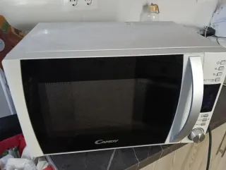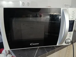 Microondas Candy en buen estado, con un pequeño detalle. - Color blanco y plateado. - Marca Candy. - Puerta con cristal negro.