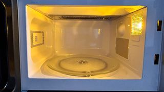 Microondas plateado con puerta espejo