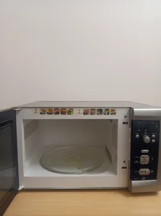 Microondas con función grill, en perfecto estado de funcionamiento. [-NO HAGO ENVIOS-] - Color plateado y negro. - Puerta abatible. - Panel de control digital.NO TIENE PLATO