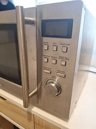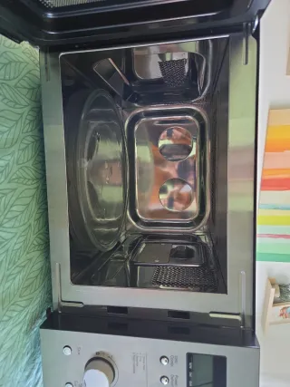 Microondas Samsung en buen estado. Funciona correctamente. - Modelo Samsung. - Color negro con detalles plateados. - Parece estar en buenas condiciones estéticas.