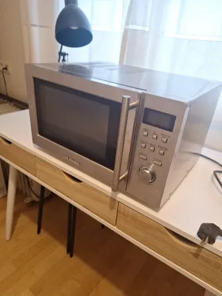 Especificaciones técnicas Capacidad: 20 litros Potencia microondas: 800 W Potencia grill: 1000 W Niveles de potencia: 5 niveles ajustables (P10, P30, P50, P80, P100) Funciones de cocción: Microondas, grill y combinadas (C-1 y C-2) Función de descongelación: Sí Temporizador: Hasta 35 minutos Plato giratorio: Sí, para una cocción uniforme Luz interior: Sí Como regalo, recambio de plato giratorio en embalaje original y base de ruedas. Dimensiones y diseño Medidas (alto x ancho x fondo): 253 x 430 x 325 mm Color: Blanco. Precio: 50€.