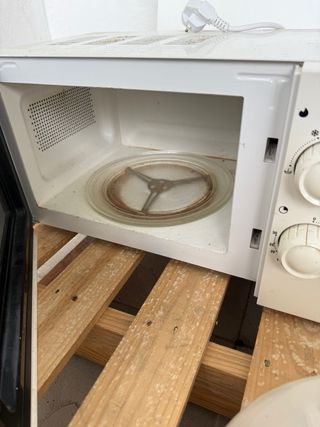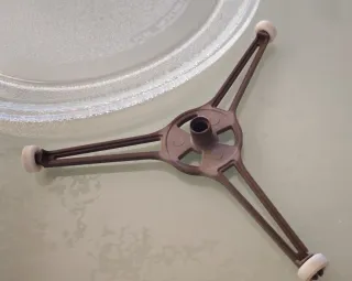 Soporte giratorio para plato de microondas. Este accesorio cuenta con tres brazos para estabilizar el plato. - Material: Plástico resistente. - Color: Marrón oscuro. - Diseño de 3 brazos con ruedas. En muy buen estado