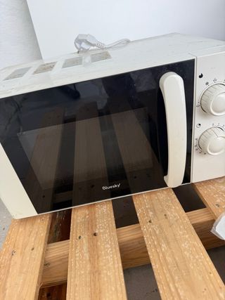 Microondas de la marca Bluesky en color blanco. Funciona perfectamente pero por dentro está un poco oxidado, de ahí su precio.