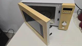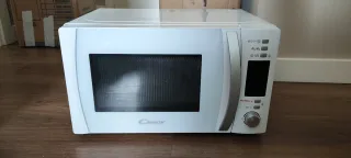 Microondas Candy en color blanco - Puerta con tirador plateado. - Panel de control con dial y botones. - Pantalla digital. - Acabado exterior blanco. Un poco de desgaste pero no es inconveniente, funciona perfectamente.