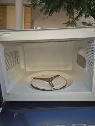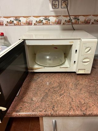Microondas de color blanco con mandos giratorios para ajustar la potencia y el tiempo. - Panel de control con indicadores. - Puerta con cristal. - Diseño compacto. Esta usado , con marcas de uso por dentro, le falta el plato de cristal , porlo demas funciona ala perfeccion. Negociable