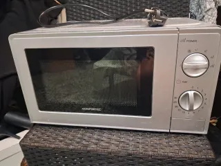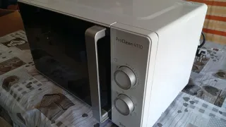 Microondas de la marca FM en color blanco. Cuenta con dos mandos giratorios para ajustar la potencia y el tiempo. Modelo MH-1020 - Mandos de potencia: Baja, Media-Baja, Media, Media-Alta, Alta. - Mandos de tiempo: Hasta 35 minutos. - Función de descongelar (Kg). - Enchufe europeo.