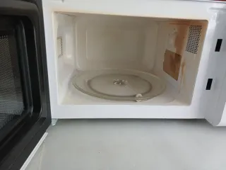 Microondas de color blanco, con mandos giratorios para ajustar el tiempo y la potencia. - Diseño compacto. - Puerta con ventana. - Panel de control intuitivo. Funciona sin problema. Está usado y algo sucio en la foto, pero va bien