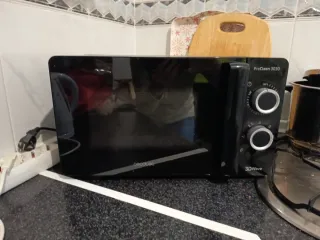 Microondas de color negro de la marca Orbegozo. Se encuentra en buen estado. - Diseño moderno y compacto. - Panel de control con botones y diales. - Puerta con asa. - Base roja.