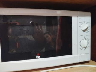 Microondas de la marca FM con un problema de funcionamiento. No calienta porque se ha ido el condensador. - Color blanco. - Panel de control con mandos giratorios para potencia y tiempo. - Puerta con ventana. - Logo de la marca FM en la parte inferior frontal.