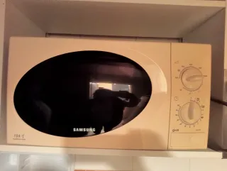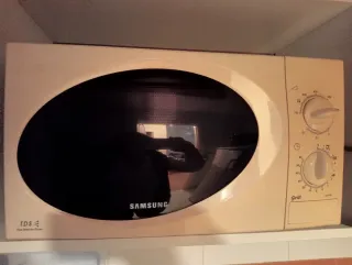 Microondas Samsung de alta durabilidad. Tecnología: Sistema de base fija/plana. No requiere plato giratorio, lo que permite introducir recipientes más grandes y facilita la limpieza. Estado funcional: Calienta correctamente. Mandos analógicos de alta resistencia. Estado estético: Presenta amarilleamiento en el frontal debido al tiempo (ver fotos), pero el interior está limpio y bien conservado Solo recogida en mano.