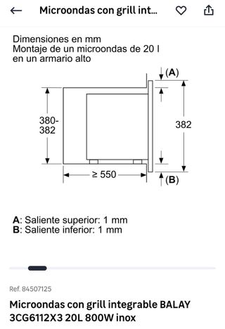 Microondas Balay de acero inoxidable para empotrar. - Diseño moderno en acabado inox. - Panel de control con pantalla digital. - Botones táctiles y dial giratorio. Las medidas indicadas incluyen el marco