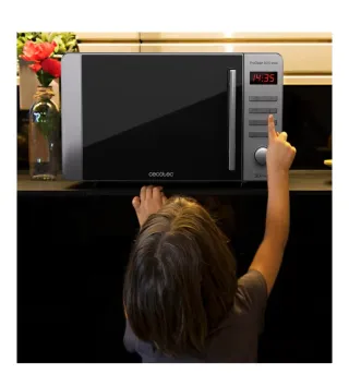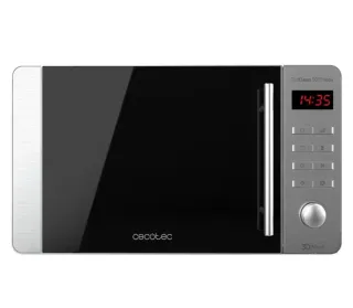 Microondas Cecotec ProClean 5010 Inox en acabado plateado y negro. - Diseño moderno y elegante. - Panel de control con pantalla digital. - Puerta con tirador metálico.