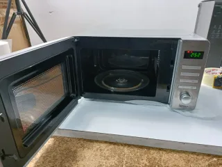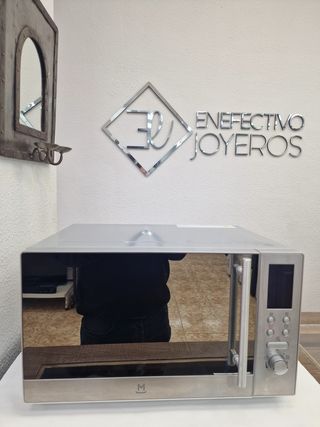 Microondas en color acero inoxidable, con un diseño moderno y compacto. El microondas está solo probado para ver que funciona. Se compró para una casa que finalmente no adquirimos y la final traía uno incorporado. Asi que lo teníamos de repuesto pero hemos decidido venderlo. Sigue en garantía. La compra fue en verano y costó 70 euros en Carrefour. Ya digo, es una oportunidad muy buena porque está impoluto.