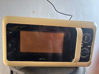 Microondas de la marca Home en color beige. Ideal para calentar y cocinar. - Diseño compacto. - Panel de control con mandos giratorios. - Puerta con ventana. - Asa integrada para apertura. Funciona perfectamente lo unico que esta mi casa de campo y llevamos tiempo si ir y tiene suciedad de hay su bajo precio esta amarillento