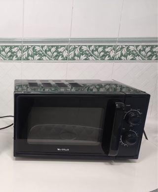 Microondas Orbegozo en color negro. Ideal para tu cocina. - Diseño compacto. - Panel de control con diales. - Puerta con asa. - Ventana para ver el interior.