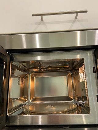 Microondas de empotrar con acabado en acero inoxidable y frontal de cristal negro. Muy poco uso, año y medio, usado para calentar café por la mañana. - Diseño moderno y elegante. - Panel de control con mandos giratorios.