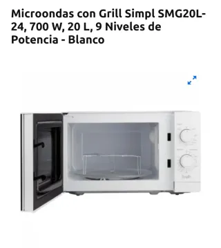 Microondas blanco con función grill de la marca Simpl. NO SE HA SACADO DE LA CAJA - Capacidad de 20 L. - Potencia de 700 W. - 9 niveles de potencia.