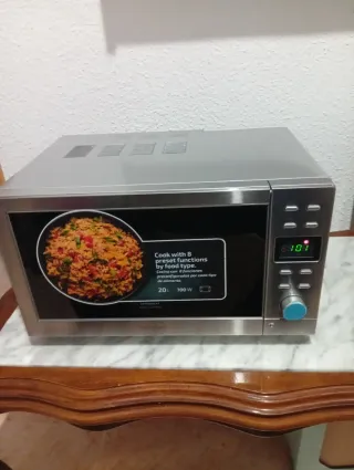 Microondas Cecotec con 8 funciones preconfiguradas. - Capacidad de 20 litros. - Potencia de 700W. - Diseño moderno en acero inoxidable -no se cómo hacerlo funcionar se mete a los autoprogramas para reparar.
