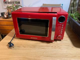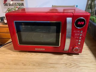 Microondas rojo estilo vintage. Está un poco deteriorado por dentro (ver fotos) pero por fuera está perfecto y funciona perfectamente, lo vendo porque he cambiado de cocina. También vendo horno pequeño. Medidas 43x29x26 cm Ancho por dentro 27 cm Alto por dentro 18 cm