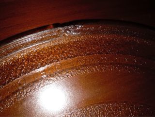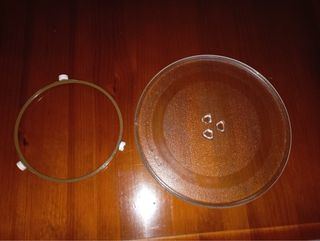 Plato de vidrio templado para microondas junto con su aro giratorio. - Plato de vidrio con tres muescas. - Aro giratorio con ruedas. Tiene una pequeña muesca en el borde pero no se nota