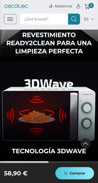 Microondas Cecotec modelo ProClean 3010 en color blanco. - Diseño moderno y compacto. - Mandos giratorios para ajustar tiempo y potencia. - Tecnología 3DWave para una cocción uniforme.