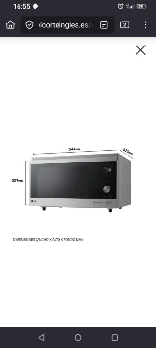 Horno de sobremesa de la marca LG. Smart Inverter 4 en 1 Microondas + horno por convención, con grill. Gran capacidad, 39 l - Diseño moderno en color plata y negro. - Panel de control digital con pantalla. - Puerta con cristal oscuro. Me falta la tapa de la cocina al vapor, pero sirve cualquier recipiente de cristal con tapa. Tengo la rejilla y el plato de fritura saludable. Lo puedes probar sin compromiso en mi casa, al lado de Pza San Francisco. Lo cambio por uno pequeño, este es de sobremesa y no tengo sitio.