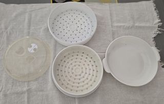 Set de vaporera para microondas en plástico blanco. Incluye base, dos rejillas y tapa. - Base redonda con asas. - Dos rejillas perforadas. - Tapa transparente con ventilación.