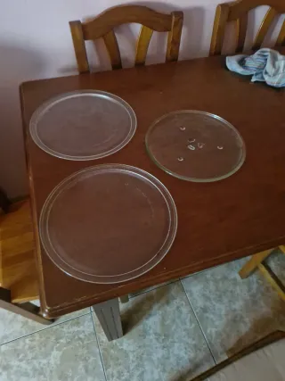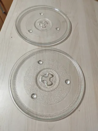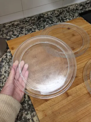 Platos redondos de cristal para microondas. Ideales para reemplazar o tener repuestos.se componen d 2 32cm y uno d 28 cm en buenas condiciones se quita por no usarlos se puede hacer un cambio por algo que me interese - Material: Cristal. - Forma: Redonda. - Diámetro aproximado: 24.5 cm.