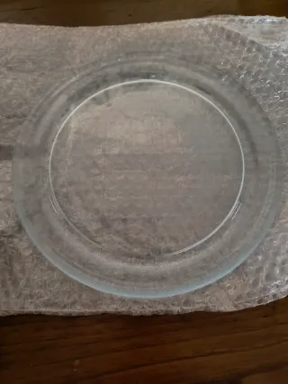 Plato redondo de cristal transparente para microondas. Ideal para reemplazar el plato original o tener uno de repuesto. - Material: Vidrio resistente. - Diámetro aproximado: 25 cm. Dispongo de 3 unidades,si quieres más de uno te hago precio