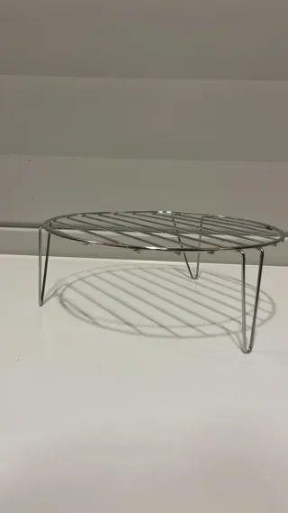 Rejilla metálica redonda para microondas o grill. Ideal para cocinar alimentos a diferentes alturas. - Material: Metal cromado. - Diseño: Redondo con patas.