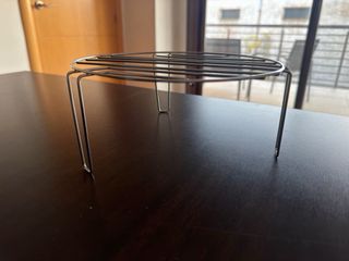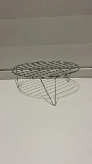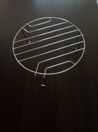 Rejilla metálica redonda con patas para usar en microondas o como base. - Material: Metal cromado. - Diseño: Rejilla circular con tres patas de apoyo. *Diámetro: 22cm *Alto: 9 cm
