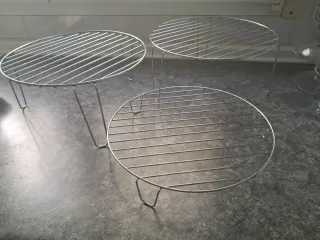 Conjunto de tres parrillas circulares de metal.28cm diámetro, 2 con patas de 12cm de altura y una de 5cm de altura - Material: Metal cromado. - Diseño: Rejilla redonda con patas de soporte.