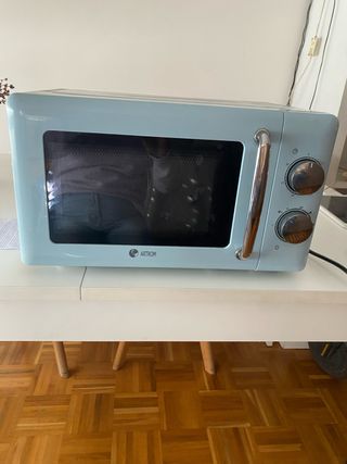 Microondas de estilo retro en color azul claro. Su diseño vintage le da un toque especial a cualquier cocina. - Puerta con asa cromada. - Panel de control con dial y botones. - Pantalla digital. UNICO DESPERFECTO ESTETICO QUE NO AFECTA A NADA 3cera y 6sexta. Por lo demás está todo perfecto; De venir a probar sin compromiso!! hay su vajo precio