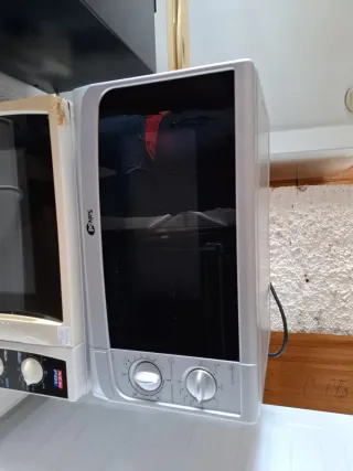 Microondas Saivod en color blanco. Un electrodoméstico práctico para tu cocina. Está deteriorado pero funciona muy bien la función de microondas. El grill no funciona. El microondas tiene bastante potencia y calienta rápido. - Diseño compacto. - Panel de control con diales.