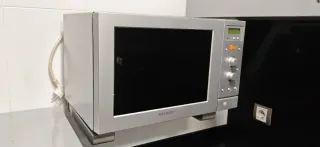 Microondas de la marca Sharp con 3 años de uso. Se vende por cambio de electrodoméstico. - Acabado plateado y negro. - Puerta con ventana. - Panel de control con botones. - Pantalla digital.