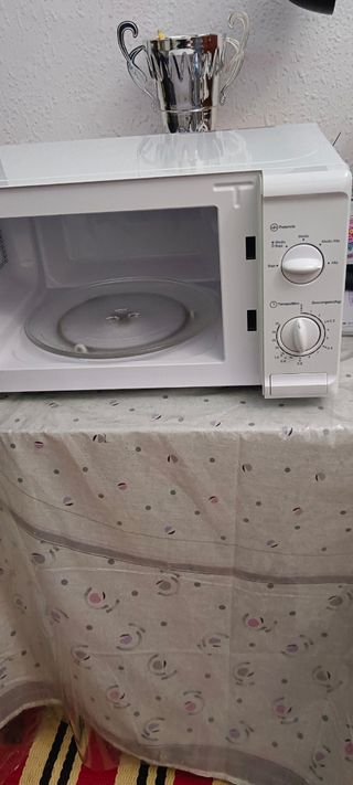 Microondas blanco de la marca Svan. - Potencia regulable. - Temporizador. - Función de descongelación. Le falta una patita. Se calza fácilmente. Mide 43,5 x 35 x 26 cm