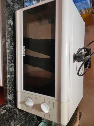 Microondas SVAN en color blanco. Funciona perfectamente,Diseño compacto y funcional. Sin plato de cristal de ahi su precio. - Mandos giratorios para potencia y tiempo. - Puerta con ventana. - Marca: SVAN