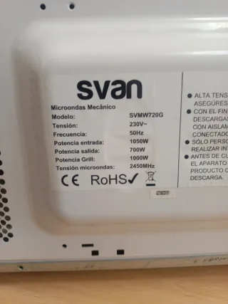 Se acepta regateo. Microondas Svan en color blanco, con una potencia de 700W. Ideal para tu cocina. - Diseño compacto y moderno. - Panel de control con mandos giratorios. - Puerta con ventana para visualizar el interior. La máxima potencia que debe usarse es el modo media-alta ya que si se usa la potencia alta durante más de 5 minutos se calienta el "motor" y deja de funcionar durante un rato.