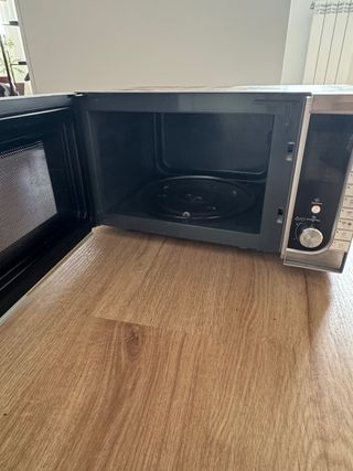 Microondas de la marca Taurus con acabado en plateado y cristal negro. En el interior esta la pintura un poco descascarillada, esta limpio y funciona perfectamente. - Diseño moderno. - Panel de control digital. - Puerta con tirador. - Base antideslizante.