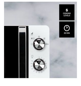 Microondas Taurus en color blanco. Un electrodoméstico práctico para tu cocina. - Diseño compacto. - Panel de control con diales para potencia y tiempo.
