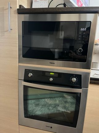 Conjunto de horno y microondas de la marca Teka, diseñados para integración. (50€ cada uno y 100€ el conjunto) - Acabado en acero inoxidable. - Panel de control con mandos giratorios.
