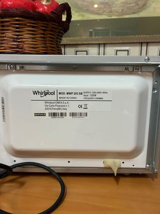 Microondas Whirlpool en perfecto estado, casi nuevo. Sus medidas son 45x32x26 cm. - Modelo: MWP 203 SB - Potencia: 1200W - Frecuencia: 2450MHz - Suministro: 230-240V-50Hz - Fabricado en Italia